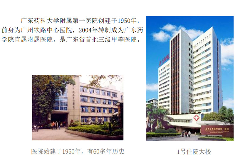 廣東藥科大學附屬第一醫院創建于1950年,前身為廣州鐵路中心醫院,2004年轉制成為廣東藥學院直屬附屬醫院,是廣東省首批三級甲等醫院。