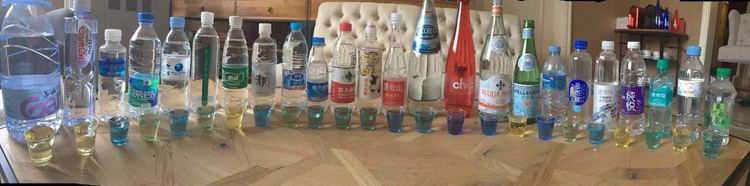 圖中,市面上常見的飲用水都用PH試劑溴百里酚藍做了檢測,顏色各不相同。一般還配上這么一句話: